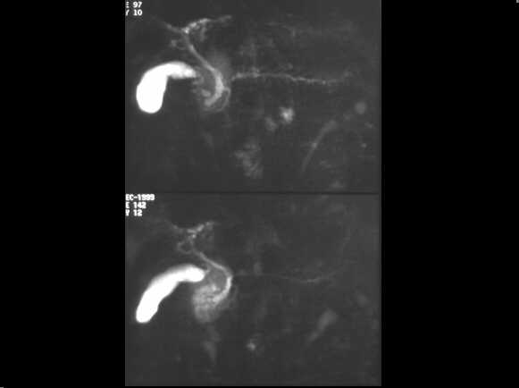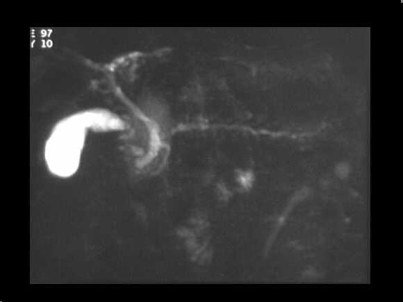 Obstructive chronic pancreatitis. MRCP examination demonstrates the chain of lakes pattern of the MPD. The CBD is also dilated.