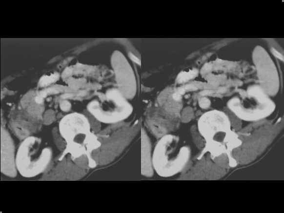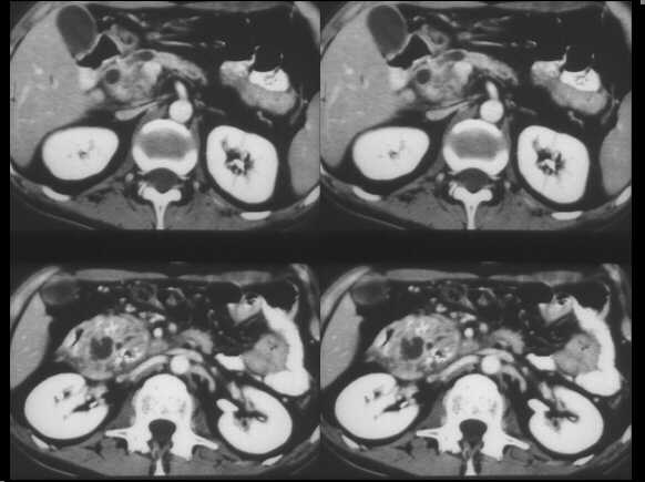 Focal autoimmune pancreatitis of the head. Spiral CT examination, before and after c.m. administration, demonstrates an enlarged head, which appears hypodense in the arterial contrastographic phase towards the spleen. Hypodensity remains appreciable in the venous phase.