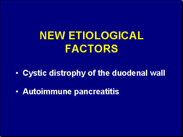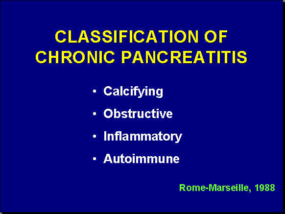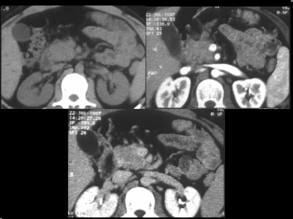 Mass-forming chronic pancreatitis. Spiral CT examination after c.m. administration. In the venous phase, the pancreatic head appears enlarged, slightly hypodense towards the remainder of the gland. A dilated MPD is recognizable within.