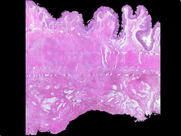 Duodenal wall in a “groove pancreatitis”. The histological important sign is the hypertrophy and the fibrosis of the muscolaris propria and the expansion of the “groove,” a virtual space, in the posterior face of the pancreata, between duodenum, pancreata and choledocus.