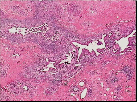Low-power view of a autoimmune pancreatitis showing a periductular inflammatory cells. The remainder of pancreatic tissue is fibrotic with complete acinar atrophy.