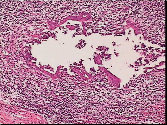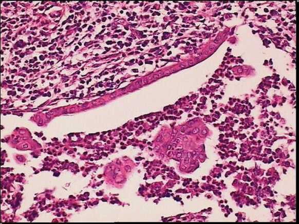 High-power view of the same slide shows the heavy inflammatory infiltrate in the epithelium layer with erosion and duct distorsion.