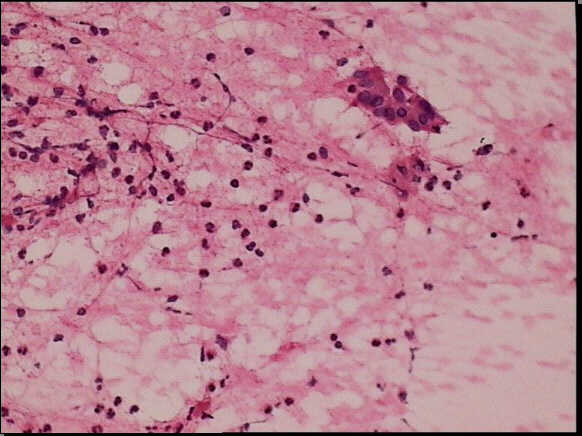 Fine needle aspiration of an autoimmune pancreatitis. In this aspirate, cohesive ductal cells and inflammatory cells can be observed.