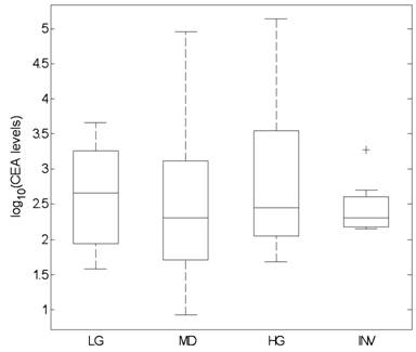 Figure 1: Box-plot comparing pre-operative CEA levels (log10(ng/mL)) with surgical pathology. The median values are depicted as the center lines within each box. The interquartile range is the difference between the bottom and top whiskers (width of each box). Whiskers extend to minimum and maximum (excluding outliers). Outliers are listed above and below the boxes. LG: low grade dysplasia; MD: moderate dysplasia; HG: high grade dysplasia; INV: invasive cancer |
