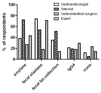 We presented a typical case of chronic pancreatitis with continuous abdominal pain and frequent exacerbations and asked which laboratory test is an important part of the diagnostics. The most common test used was fecal elastase (54/110, 49.1%). Fecal elastase was most often chosen by gastroenterologists (25/34, 73.5%) and by experts in 71.4% (5/7). On the other hand, amylase was considered as a diagnostic tool in chronic pancreatitis by 42.9% (3/7) of experts, compared to 38.2% (13/34) of the gastroenterologists, 27.3% (6/22) of the gastrointestinal surgeons and 72.1% (31/43) of the internists (Figure 1). When subsequently asked which imaging modality was used first at suspicion of chronic pancreatitis, only a minority (22/91, 24.2%) of all respondents considered transabdominal ultrasonography as useful in diagnosing chronic pancreatitis, compared to 71.4% (5/7) experts (Figure 2). The majority of the respondents (63/91, 69.2%) indicated they used CT instead as the confirmatory test, whereas only 2 out of 7 (28.6%) experts would perform a CT in this case.