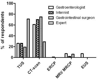 Figure 2. In a clinical vignette, the respondents were asked which radiological modality they prefer first diagnostic tool in considering chronic pancreatitis in a patient. TUS: transabdominal ultrasonography |