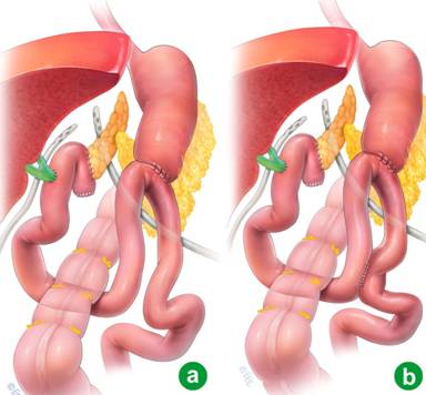 A Braun enteroenterostomy, when performed, was constructed approximately 25 cm distal to the gastroenterostomy by a side to side stapled anastomosis, with two firings of 45 mm length vascular stapler in opposite directions. The enterotomy was closed in two layers (3/0 Vicryl and 3/0 Silk). The defect between the small bowel limbs and the mesentery was closed with interrupted 3/0 Silk sutures. Approximately 10 to 20 minutes was required to complete this anastomosis.