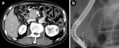 Figure 1. Image findings at the initial diagnosis of autoimmune pancreatitis. a. Computed tomography showed slightly low-dense and enlarged pancreatic head (arrow). b. Endoscopic retrograde pancreatography demonstrated a diffuse, irregular narrowing of the main pancreatic duct. |