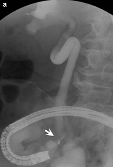 Six months after starting steroid treatment, a right hydronephrosis appeared on the CT image. This urinary dilation disappeared two months later; however, bilateral hydronephrosis re-emerged in another two months. The dilation included the entire ureter, from the ileal junction to the renal pelvis, without ureteral stones. In the subsequent treatment course, the patient suddenly developed septic shock. Because of the existing hydronephrotic findings, urinary infection was suspected. The causative bacterium detected in the blood was Proteus mirabilis, which was also positive in the urine culture, and a suitable antibiotic was administered. Retrograde ureteropyelography using duodenoscope showed a severe stricture at the upper portion of ureteroileal junction, 8 mm in length (Figure 2a). A double-J stent (7F) was inserted and a similar attack never reoccurred, although the spontaneous remission and recurrence of the bilateral hydronephrosis was repeated.