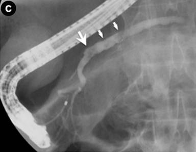 Figure 2. Images of systemic lesions after starting steroid therapy. a. Endoscopic retrograde ureterography showed a stricture at the lower portion of right ureter, 8 mm in length (arrow). b. Following computed tomography demonstrated a large stone (7x10 mm) stuck in the main pancreatic duct at pancreatic head (arrow) and many small stones distributed within the pancreatic body and tail. c. Following endoscopic retrograde pancreatography demonstrated a stone stuck in the dilated main pancreatic duct at pancreatic head (arrow) and floating stones in the upstream (small arrows). |