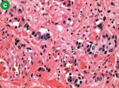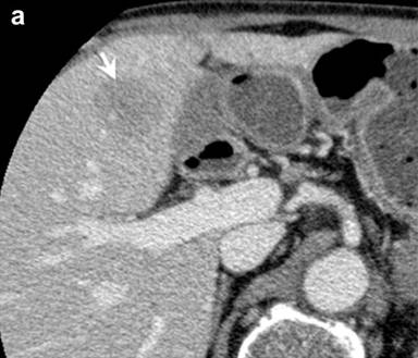 Figure 3. Hepatic metastasis of the bladder cancer. a. CT showed an ill-enhanced, round-margined, tumor in the right lobe of the liver (arrow). b. Histology of percutaneous hepatic biopsy showed urothelial carcinoma, the same as that of urinary bladder resected 5 years and 6 months before (c.) (H&E, x100). |
