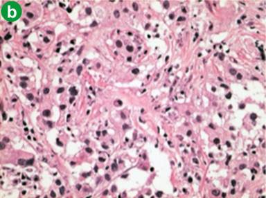 Following the diagnosis of autoimmune pancreatitis, screening CT images demonstrated pelvic lymph nodes that gradually increased in size (about 1.5 cm) and number. In June 2009, following CT detected an ill-enhanced hepatic tumor (Figure 3a). Endoscopic examinations denied upper and lower gastrointestinal tumors that could be the origin of hepatic tumor. Various candidates were considered, such as pseudotumor, cholangiocarcinoma, hepatocellular carcinoma, hepatic adenoma and metastasis of past bladder cancer. Percutaneous needle biopsy was performed to reach a final diagnosis. Histology of the biopsy tissue was urothelial carcinoma (Figure 3b), the same as in the bladder resected 5 years and 6 months previously (Figure 3c). The patient refused a second operation. Chemotherapy with gemcitabine was initially effective, but failed in one year, and metastasis developed in the adrenal gland, paranasal sinuses, and cervical vertebrae. Second line therapy by paclitaxel was not effective and the patient succumbed in January 2011.