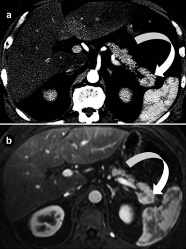 Intrapancreatic accessory spleen (IPAS) refers to a focal mass of ectopic splenic tissue located within the tail of the pancreas. It originates embryologically from failure of fusion of the splenic anlarge in the dorsal mesogastrium. While found in 10-30% of post-mortem cases, Mortele et al. reported a prevalence of intrapancreatic accessory spleen of 2 in 1,000 consecutive patients that underwent abdominal CT imaging on older generation computed tomography (CT) scanners [2]. This radiological under-call is due to the small lesion size (a significant proportion of intrapancreatic accessory spleen measure 2 cm or smaller in size) making detection more difficult [3, 4]. However, the last decade has borne witness to a technological imaging revolution with rapid improvements in the diagnostic capabilities of cross-sectional imaging modalities such as CT and magnetic resonance imaging (MRI). As these powerful tools are able to detect and resolve lesions with increasing clarity and precision, this has led to a corresponding increase in the detection of incidentalomas on imaging. Many of these incidentalomas are small, asymptomatic and clinically occult. This leaves clinicians with the dilemma of what to make of these incidentalomas, their clinical significance, and how they should be appropriately managed. Within this context, it is reasonable to anticipate that the prevalence of intrapancreatic accessory spleen will increase due to improvements in imaging technology. As a benign asymptomatic condition, intrapancreatic accessory spleen does not require treatment and may be regarded as a ‘do not touch lesion’. The clinical and imaging dilemma lies in that intrapancreatic accessory spleen is frequently misdiagnosed for a pancreatic malignancy. In some cases, this may be due to poor awareness and understanding of the condition. In others, a working diagnosis of intrapancreatic accessory spleen is not entertained for the fear of missing a malignancy. This is regrettable as misdiagnosing intrapancreatic accessory spleen for a pancreatic malignancy leads to unnecessary patient anxiety and inappropriate patient management. This includes performing a distal pancreatectomy which subjects patients to unwarranted postoperative morbidity and risk of postoperative complications.