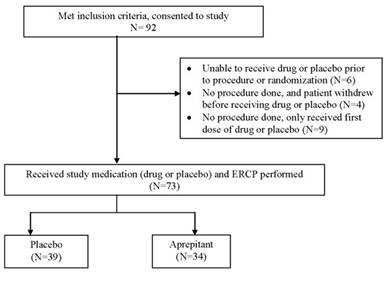 All statistical analyses were performed using SAS Enterprise Guide (version 4.3; Cary, NC, USA). Baseline characteristics between the aprepitant and placebo group were compared using Fisher’s exact test for dichotomous, the Pearson chi-square for categorical variables, and the unpaired Student t-test for continuous variables. The primary end-point was presence or absence of pancreatitis up to 7 days post-procedure in the treatment and control arms, measured by Fisher’s exact test using an intention to treat analysis. Two-tailed P values less than 0.05 were considered significant.