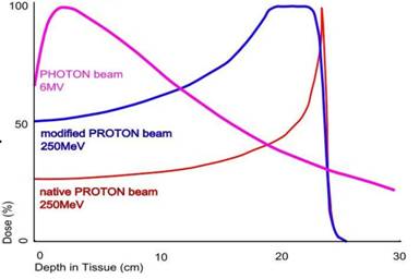 Figure 1. The dose distributions of photons and protons, including the characteristic Bragg Peak of the single proton beam profile. |