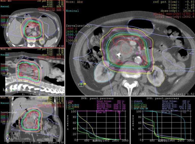 The study by Hong et al. in Abstract #4021 is important at several levels [1]. First, by using a shorter chemoradiotherapy course (5 Gy x 5 fractions in consecutive days), their multi-modality approach allows resectable pancreatic cancer patients to get to surgery earlier than standard course chemoradiotherapy, which can take 5-6 weeks to complete. Furthermore, this regimen showed good tolerability. Chemoradiotherapy with 3-dimensional conformal radiotherapy (3D-CRT) or intensity modulated radiotherapy (IMRT) is often limited by the radiation dose tolerances of the bowel, liver, stomach, spinal cord, and kidneys. The dosimetric advantages achieved with proton beam therapy may be a key component of this regimen’s excellent toxicity profile (Figures 1 and 2). While proton beam therapy, as a technique, has been limited by the relatively few number of proton centers and questions regarding its cost-effectiveness [5], this study offers yet another application of this emerging, alternative technology. Abstract #4021 demonstrates the promise that larger fractions of radiotherapy delivered in shorter courses, known as hypofractionated radiotherapy, and proton beam radiotherapy may be emerging techniques to add into the pancreatic cancer treatment toolbox. Neoadjuvant chemoradiation, with improved radiotherapy techniques, remain promising as part of the multi-modality approach towards pancreatic cancer.
