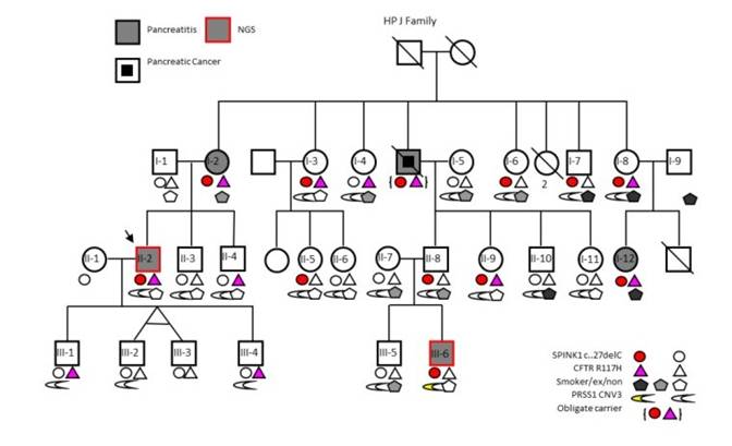 WES results were confirmed by individual assay, testing all samples of family J with available DNA as well subsets of Hereditary Pancreatitis Study (HP: Dr Whitcomb, principal investigator) and North American Pancreatitis Study II (NAPS2; Dr Whitcomb, principal investigator) cohorts for SPINK1 c.27delC, PRSS1 CNV and CFTR R117H.