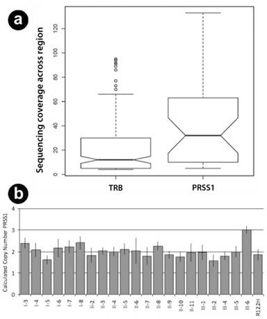 Figure 2. WES and confirmatory CNV of PRSS1. a. PRSS1 coverage of case III-6. Observed coverage of sequencing fragments from WES in reference region (T-cell receptor beta locus: TRB) and PRSS1. Mean coverage of PRSS1 (38.67) was significantly higher than in TRB (20.60), P=0.004 using Welch two sample t-test (95% CI of the difference: 6.04-30.09). Box-whisker plot: boxes are defined by the second and third quartile sections of the data; whiskers indicate the first and 4th quartile sections of the data. The cross bar is the mean and the notches are indicators of the standard error of the mean. Non-overlap of notches is an indicator of significant differences in distribution using non-parametric approaches. Circles are considered outliners. b. PRSS1 copy number variant assay of pedigree 21. PRSS1 copy number is plotted for family members, and an unrelated hereditary pancreatitis PRSS1 R122H case. All samples had the expected copy number of 2, except III-6, with CNV3. The mean and min/max results for each assay are shown. |