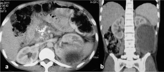 Figure 1. a. CECT abdomen showing calcification in the head of the pancreas and the left perinephric abscess. b. Coronal section showing the left perinephric abscess. |