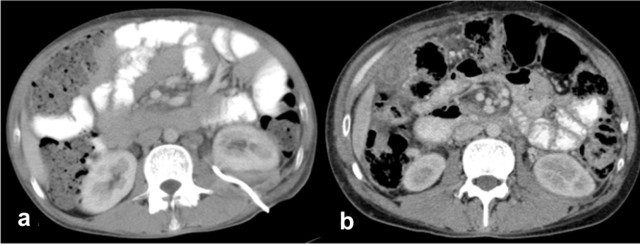 Figure 2. a. CECT abdomen showing the percutaneous catheter drainage of the left perinephric abscess. b. Follow-up CECT showing resolution of the perinephric abscess. |