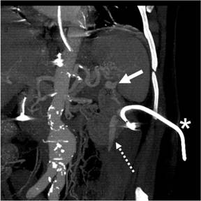 Figure 1. Coronal reformatted CT image demonstrates a splenic artery pseudoaneurysm (arrow), percutaneous drain (asterisk) and active extravasation of intravenous contrast (interrupted arrow) extending inferiorly from the region of the pseudoaneurysm and percutaneous drain. |