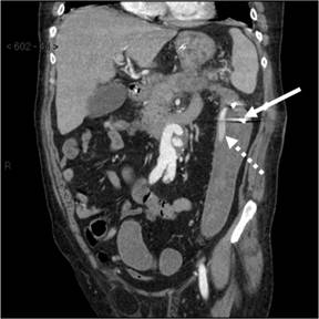 Figure 2. Coronal reformatted CT image demonstrates the position of the percutaneous drain in the colon lumen (arrow) and extravasated intravenous contrast mixed with unopacified blood in the descending colon (interrupted arrow). |
