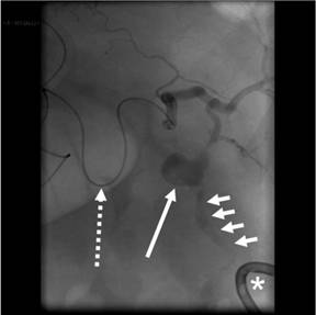 Figure 3. Angiography image with a microcatheter in the splenic artery (interrupted arrow) demonstrates the splenic artery pseudoaneurysm (long arrow) with active contrast extravasation (short arrows) into the colon in close proximity to the percutaneous drain (asterisk). |