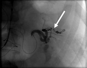 Figure 4. Angiography image demonstrating successful occlusion of the splenic artery branch with metal coils (arrowed). |