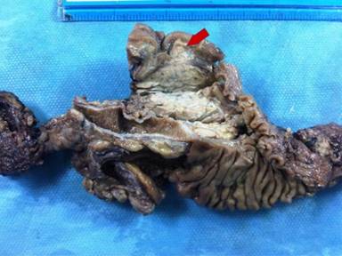 Figure 1. Pancreaticoduodenectomy specimen showed a growth measuring 1.5x1.0 cm. in the periampullary region (arrow). |