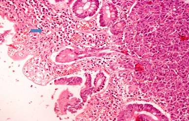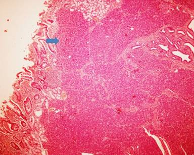Figure 3. Section showed focal ulceration and mixed inflammation of mucosa in pariampullary region (arrow). |