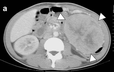 A Japanese man at age of 43 years attended at our hospital, complaining of severe general fatigue and weight loss of 10 kg in the last 3 months. He had more than 10 times movements of watery diarrhea a day. He was severely dehydrated, and blood urea nitrogen (BUN) and creatinine levels were increased to 211 mg/dL (reference range: 8-20 mg/dL) and 3.80 mg/dL (reference range: 0.61-1.04 mg/dL), respectively. With institutional treatment of hydration and correction of electrolytes, systemic examination was done. A large mass was palpable in the left upper abdomen, and CT demonstrated a wrist-sized tumor in the tail of the pancreas (Figure 1a). The serum K+ level was slightly decreased at 2.8 mEq/L (reference range: 3.5-5.0 mEq/L) and Ca2+ was 9.3 mg/dL (reference range: 8.4-10.4 mg/dL). Tumor markers such as alpha-fetoprotein (AFP), CEA and CA 19-9 were within the normal range. The blood levels of VIP and calcitonin were increased to 649 pg/mL (reference range: 0-100 pg/mL) and 66,700 pg/mL (reference range: 15-86 pg/mL), respectively. The glucagon level was slightly elevated, and other hormone levels were in normal range. There was no palpable nodule in the thyroid or neck region. CT and MRI detected no other tumor except the pancreatic tumor, and the accumulation of 18F-fluorodeoxy-glucose was detected only in the pancreas by PET. On day 5 after the admission, intracutaneous injection of octreotide was started at a dose of 100 μg/day, and on day 10 the dose was increased to 200 μg/day. The bowel movement was reduced, and general condition was improved. On day 33, the patient underwent pancreaticosplenectomy and partial resection of the transverse colon.