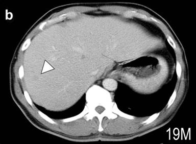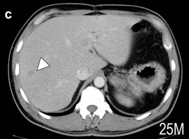 Figure 1. CT scan image of the abdomen. a. Large tumor was found at the tail of the pancreas (arrow heads). The CT scan of the liver 19 months (b.) and 25 months (c.) after the operation. Arrowheads indicate one of the metastatic tumors. The size appeared unchanged at 25 months. |