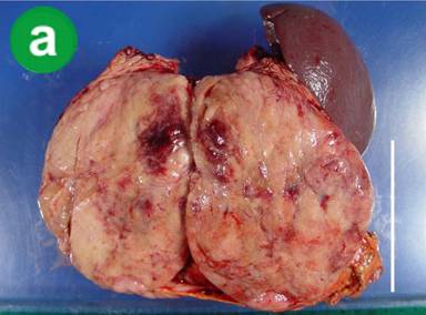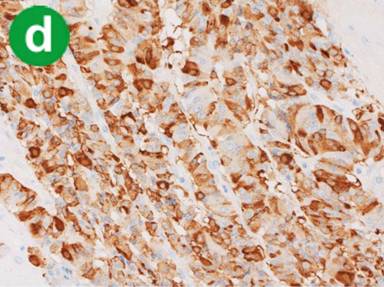 Figure 2. The macroscopic and histological appearance of the resected tumor. a. The resected tumor was solid, and there was a small focus of hemorrhage on the cut surface (scale equal to 10 cm). b. The tumor cells had lightly eosinophilic cytoplasm and proliferated around the blood vessels. c. Approximately 10% of tumor cells were immunostained with VIP. d. The most of the tumor cells were positive for calcitonin. |
