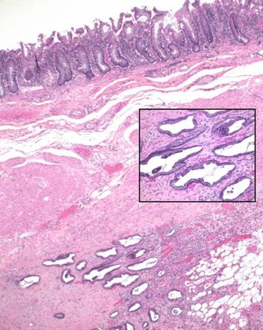 Figure 2. Pancreatic adenocarcinoma involving the colonic wall and subserosal fat with associated acute inflammatory cells secondary to colonic perforation elsewhere. Note that the tumor does not involve the colonic mucosa. (H&E, 20x). Inset: cytoplasmic and intraluminal blue mucin is present consistent with mucinous differentiation (H&E, 100x). |
