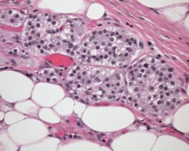 Figure 3. Pancreatic adenocarcinoma invading the peripancreatic fat (H&E, 200x). |