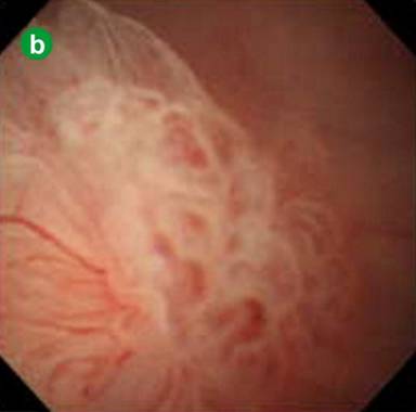 Figure 2. a Duodenoscopy with a lateral viewing of endoscope showed mucus discharged from the enlarged papilla of Vater. b. Peroral pancreatoscopy showed the papillary tumor on the main pancreatic duct. c. Pathological examination of biopsy specimens of the tumor showed papillary mucinous adenoma. |