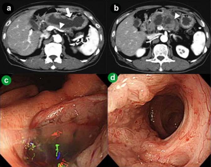 Figure 3. a. Computed tomography (CT) showed the main pancreatic duct penetrating to the stomach (arrow) and reperfusion of the splenic vein (arrowhead). b. CT showed increased size of the papillary tumor in the main pancreatic duct. c. Gastroduodenoscopy showed gastropancreatic fistula on the lesser curvature of the middle gastric body. Mucus was discharged from the fistula. d. Suction of the mucus enabled us to pass an endoscope into the dilated main pancreatic duct through the fistula and directly examine the lumen of the main pancreatic duct and the papillary tumor adjacent to the fistula. |