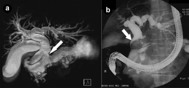 Two and a half years after the first admission, he reported jaundice and serum bilirubin concentration was elevated (4.5 mg/dL; reference range: 0.2-1.2 mg/dL). CT and MRI revealed dilation of intrahepatic bile duct and the branch duct of the pancreas penetrating to the common bile duct (Figure 4a). Endoscopic retrograde cholangiopancreatography (ERCP) was performed, revealing filling defect in the middle common bile duct, which consisted of mucus discharged from the fistula (Figure 4b). Endoscope biliary drainage by stent placement was performed to alleviate the obstructive jaundice. However, the stent slipped out of the bile duct automatically. It was probably because of the viscosity of the mucus in the bile. Percutaneous biliary drainage or choledochojejunostomy could have alleviated the jaundice, but he refused any further treatments. He had recurrent cholangitis due to cholestasis, which oral levofloxacin was effective to ameliorate. Despite jaundice and recurrent cholangitis, he is still ambulatory and seen in the clinic three years after the first admission.