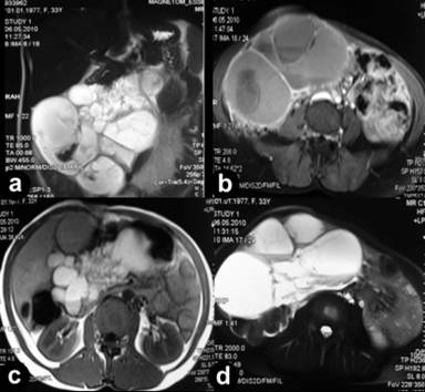 Figure 1. a. Coronal T2-weighted image shows the multiloculated cystic mass extending from right sub-hepatic space to the pelvis. b. Axial T1-weighted image depicts the thin walls and multiple fine septations enhanced after intravenous contrast injection and fluid levels with different intensity. c. Axial T1-weighted image shows the multiloculated, multiseptated hyperintense lesion in the pancreatic space. d. A more caudal axial T2-weighted image showing multiloculated hyperintense cystic mass with fluid levels and multiple septations. |