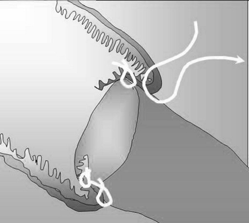 Figure 3. Pancreaticojejunostomy. The transpancreatic U-suture was needled from the anterior outside of jejunum to the cut edge. |