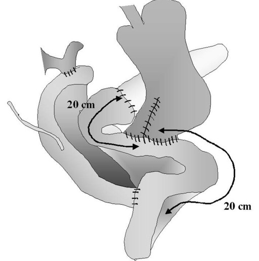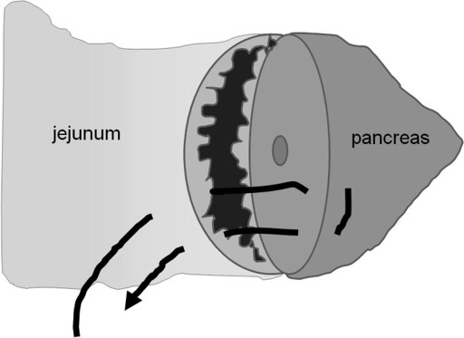 The jejunum is transected at about 20 cm from Treitz’s ligament, reflected upward through an incision in the transverse mesocolon, and anastomosed end-to-side with the choledochus by one layer of interrupted 4-0 polydioxanone surgical suture. At 20 cm distal to this biliary anastomosis, the jejunum is interrupted, and the end of the pancreas is inserted into the bowel by means of an invagination technique. The pancreaticojejunostomy is made in two layers with interrupted sutures of 3-0 silk and 4-0 polydioxanone to hold the end of the pancreas in place in the invaginated bowel. At 20 cm distal to this pancreaticojejunostomy, the jejunum is anastomosed to the stomach in an end-to-side fashion. Approximately 20 cm distal to the gastrostomy, a Y-type reconstruction of the jejunum is made with the distal end of the biliary route. Biliary or pancreas duct drainage tubes are not necessary, and just one drainage tube is placed that is pulled out within 4 days after surgery. The full details were described previously [37].